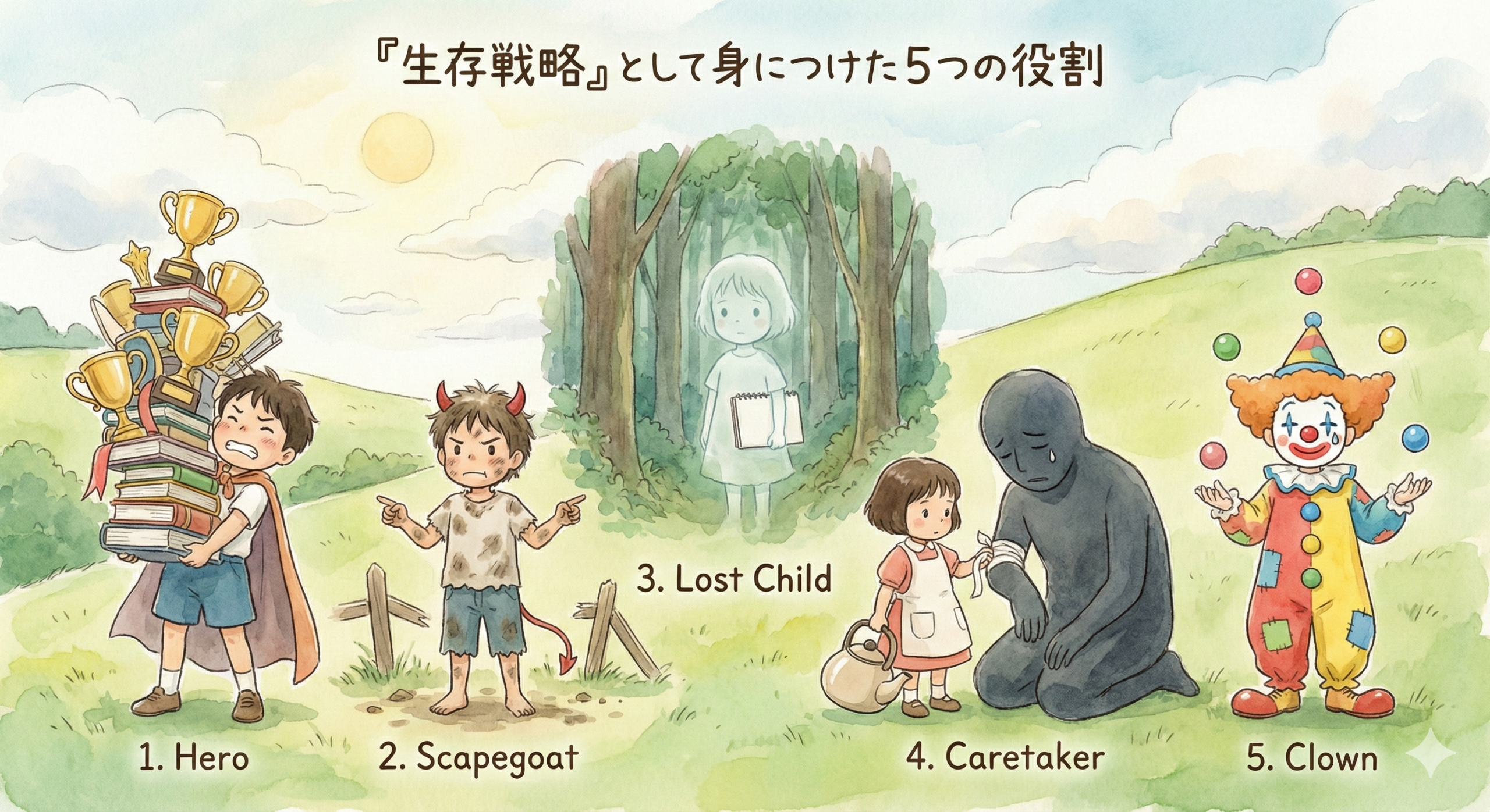 機能不全家族の中で生き抜くために、子供たちは無意識に特定の「役割」を演じることがあります。これを理解すると、今の生きづらさの根源が見えてきます。