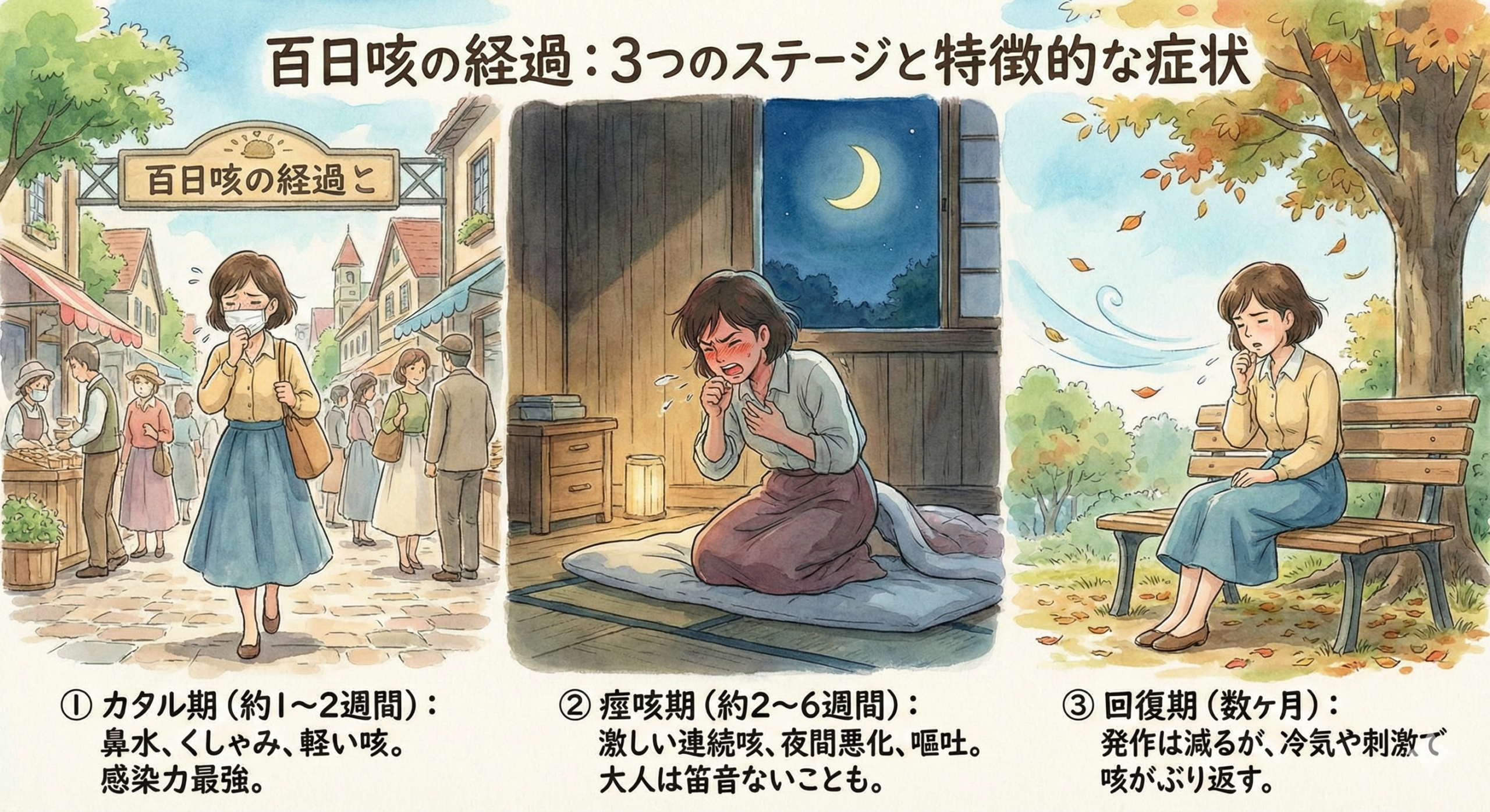 百日咳はその名の通り、完全に治癒するまでに約3ヶ月(百日)近い時間を要することがあります。症状は時期によって大きく3つのステージに分かれます。