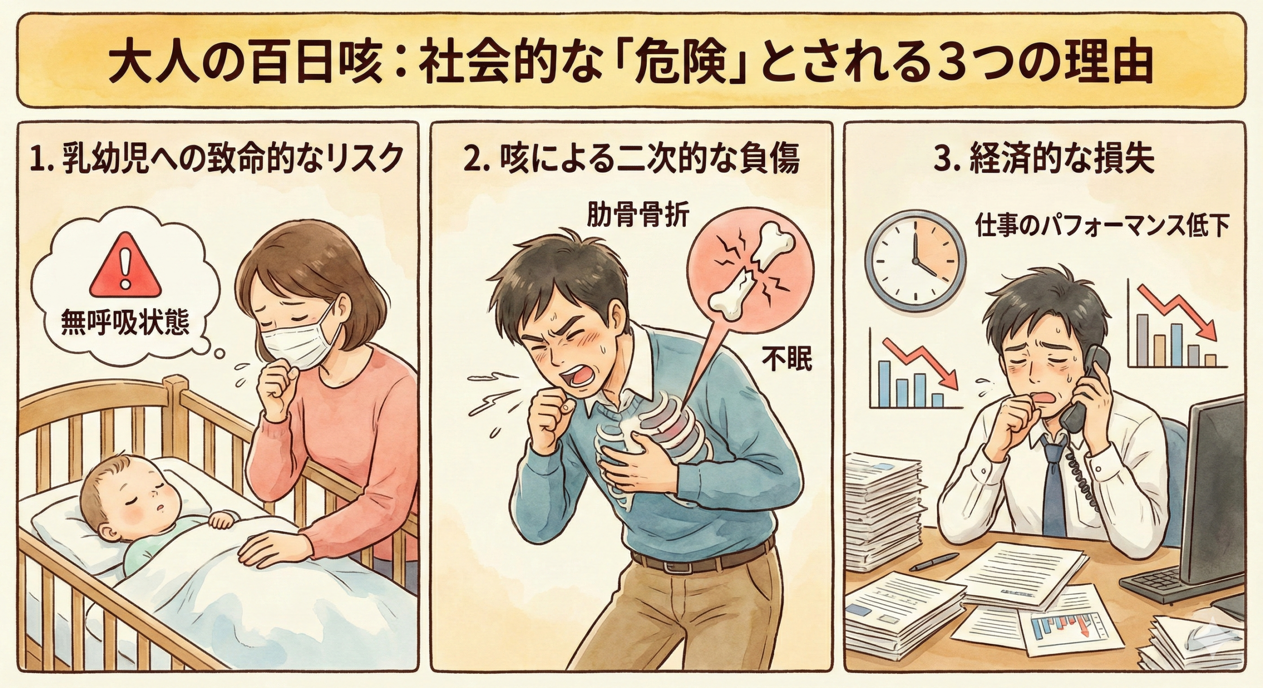 大人の場合、百日咳で命を落とすことは稀です。しかし、医学的・社会的に放置してはいけない理由が3つあります。