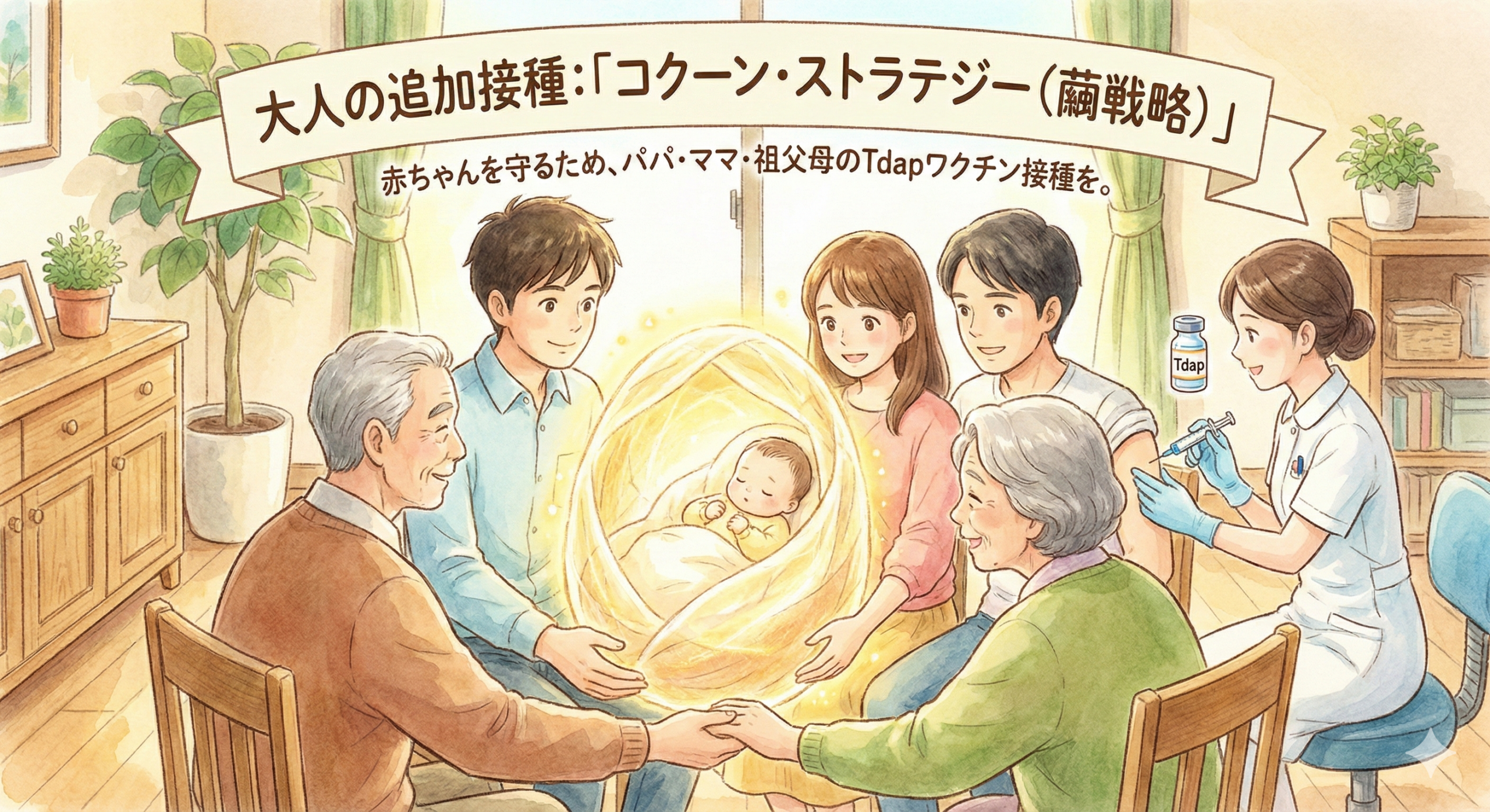 「子どもの頃に打ったから大丈夫」は通用しません。現在、日本でも「大人向けの三種混合ワクチン(Tdap)」の任意接種が推奨されています。 特に、これからパパ・ママになる方、おじいちゃん・おばあちゃんになる方は、赤ちゃんを守る「コクーン・ストラテジー(繭戦略)」として、追加接種を検討する価値が十分にあります。