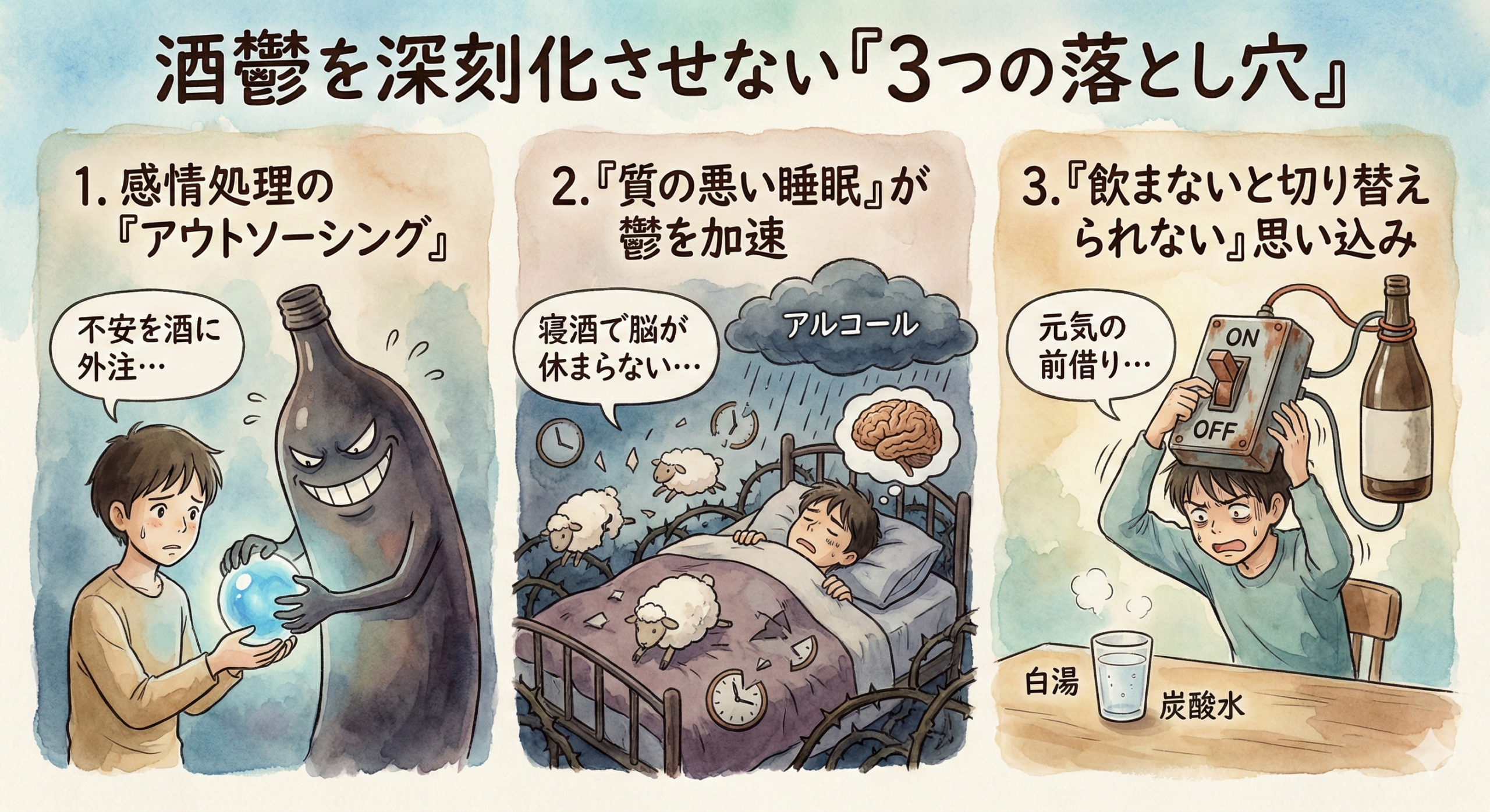 酒鬱を繰り返すと、脳の回復機能は徐々に衰え、本当の「うつ病」へと移行するリスクが高まります。以下の3つの罠に注意してください。